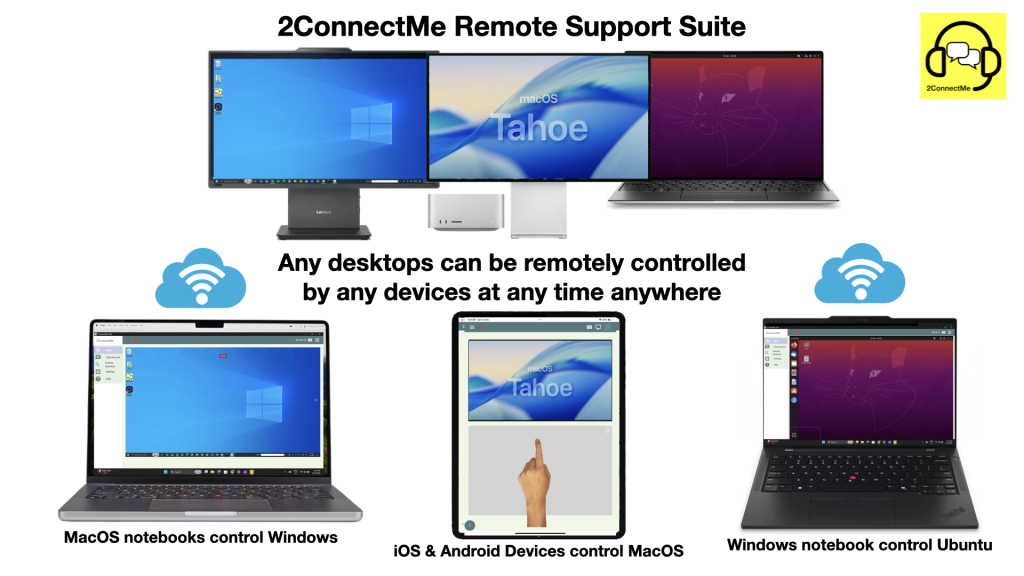 Just a simple Tap / Click to connect to your remote Mac / Windows / Ubuntu desktops from iOS / Android mobile devices or Mac / Windows / Ubuntu desktops.