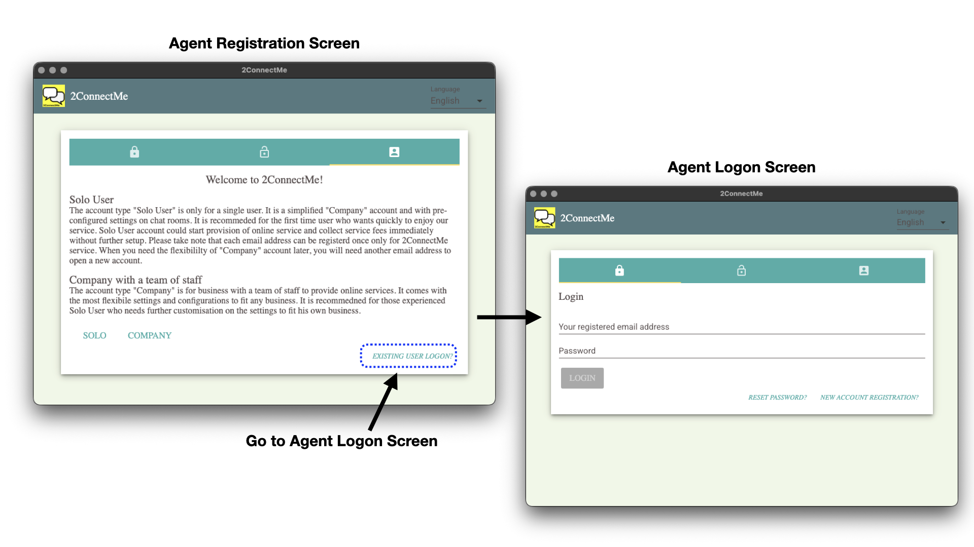 It only needs registration once for accessing to the services on all the platforms. If you have the account created before, you can switch to “Agent Logon” screen directly from “Agent Registration Screen” at 1st launch of the app as indicated below.