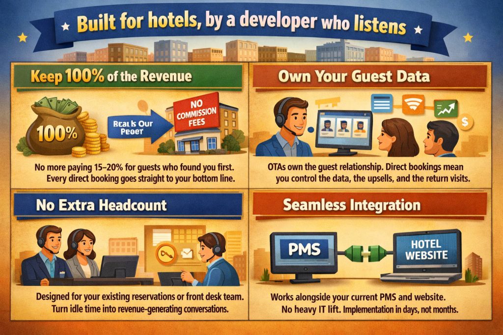 Book direct, save commission The guest books directly through your website or over the call. You save 15%-20% commission. You own 100% of guest data, and build a relationship that lasts beyond a single stay.