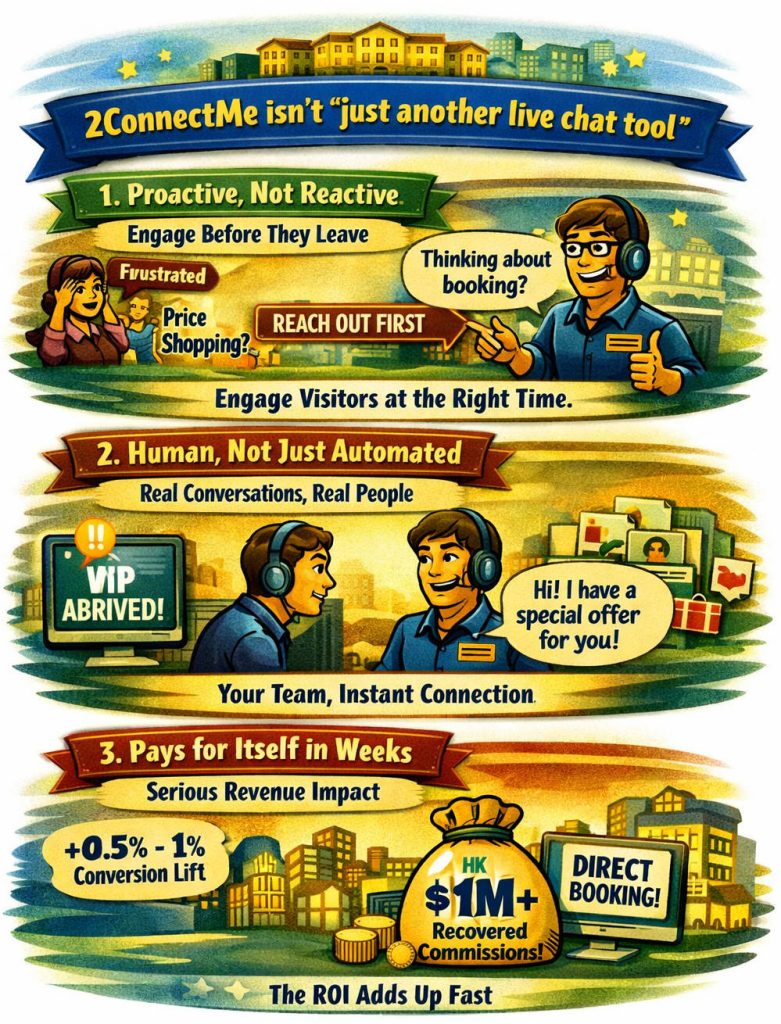 Lift conversion by 0.5-1% on your existing traffic. For a 200-room hotel in Hong Kong, that’s HK$500k–1M+ in recovered commission annually. The math is simple. You knows the spreadsheet.