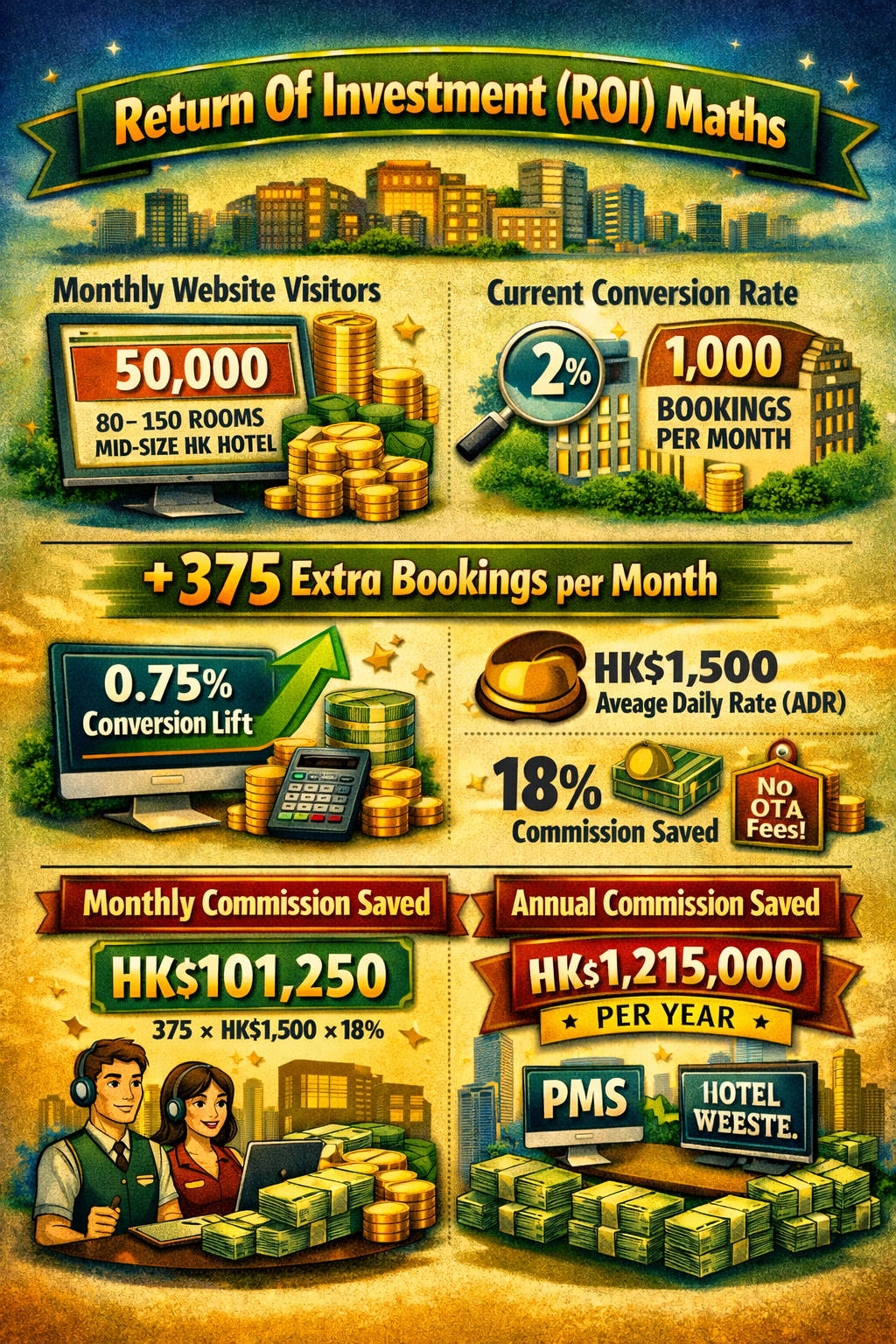 For a mid-size Hong Kong hotel with 50,000 monthly website visitors, 2% baseline conversion, and HK$1,500 Average Daily Rate (ADR):