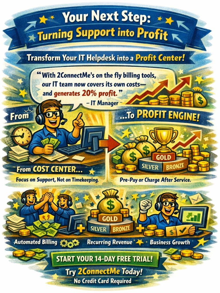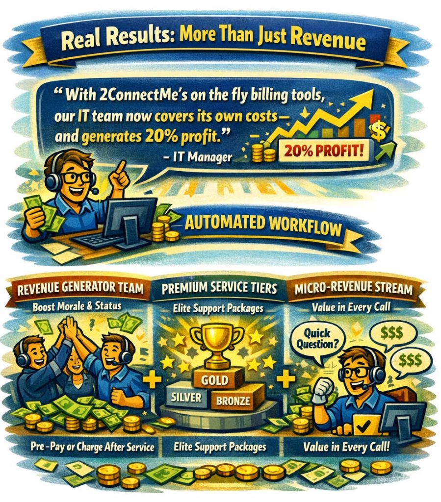 This isn’t just a theoretical concept. Businesses using this model are seeing transformative results. As one IT manager using 2ConnectMe’s automated billing tools noted: “With 2ConnectMe’s on the fly billing tools, our IT team now covers its own costs—and generates 20% profit.”