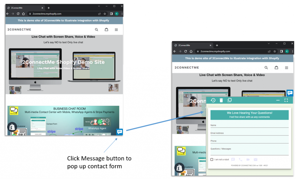 A demo site is built with sticky message chat button on Shopify platform. Click the link here to open such demo html page.