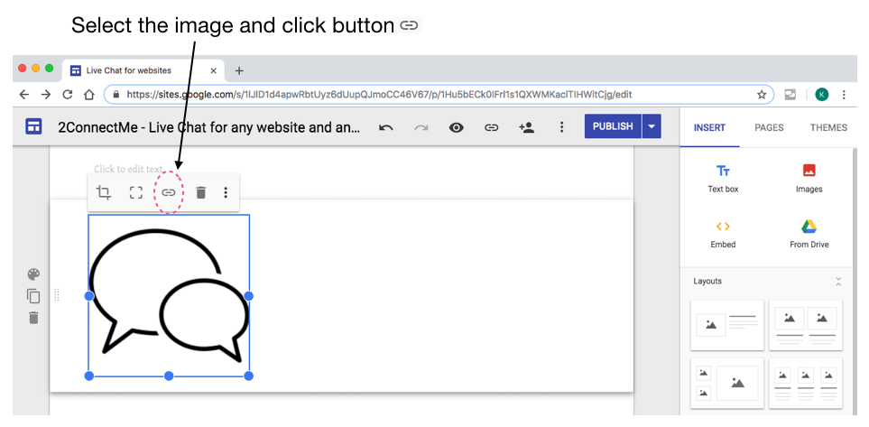 Go to the location of your edited page to place the image, e.g. Chat Icon. Then, Click Image button. Upload your image or select from your Google drive.