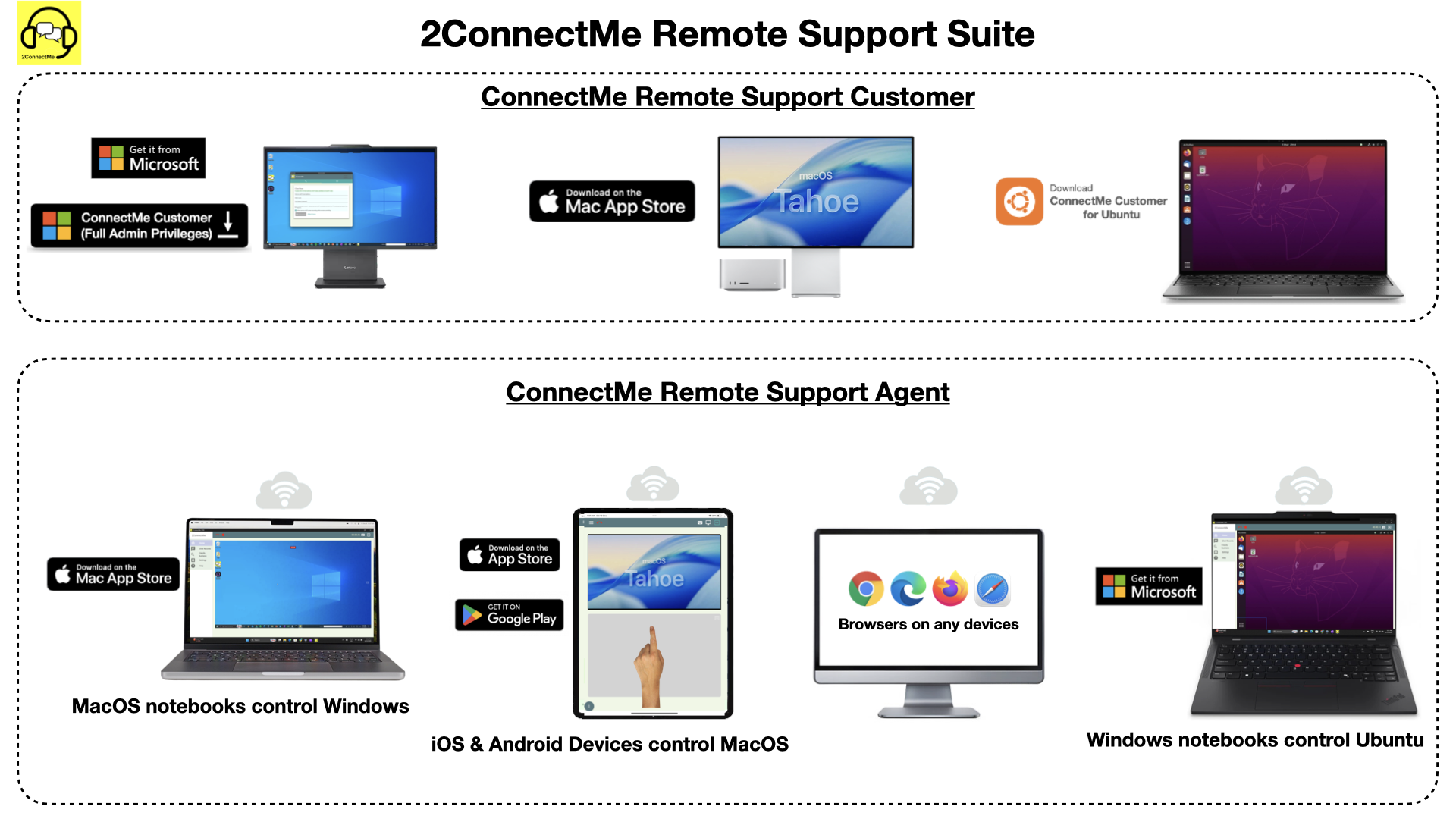 2ConnectMe Remote Support Suite is composed of apps for “Customer” and “Agent” service staff correspondingly. It needs to install these two apps on customer computer and service staff device according to their own platforms as indicated above.