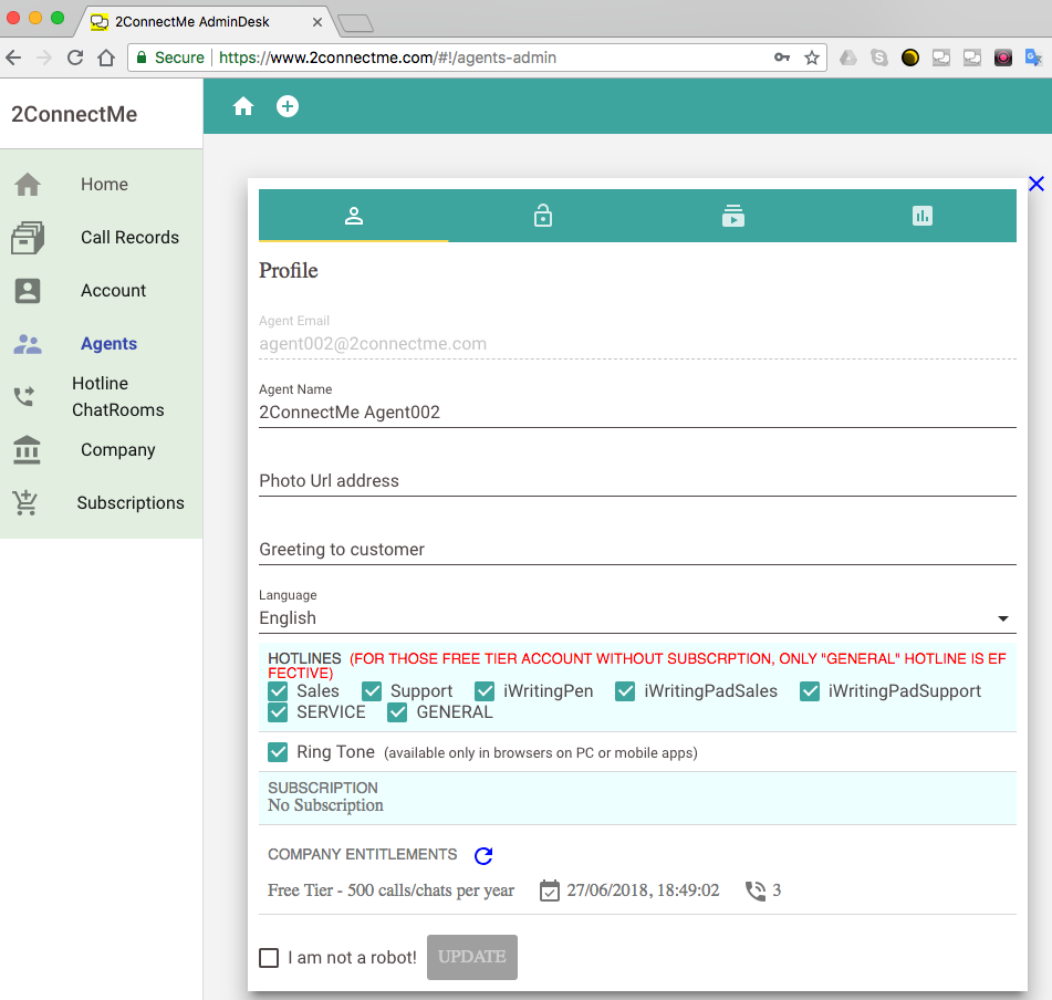 In this release, the WordPress Website will be linked to a 2ConnectMe administrator account. Therefore, after upgrading to this WordPress Plugin release, you will be directed to Agent Logon page. You just need to use your own 2ConnectMe admin account to logon again. After logon, the latest Chat Room URLs will be imported to your WordPress Plugin for your to set it up again.